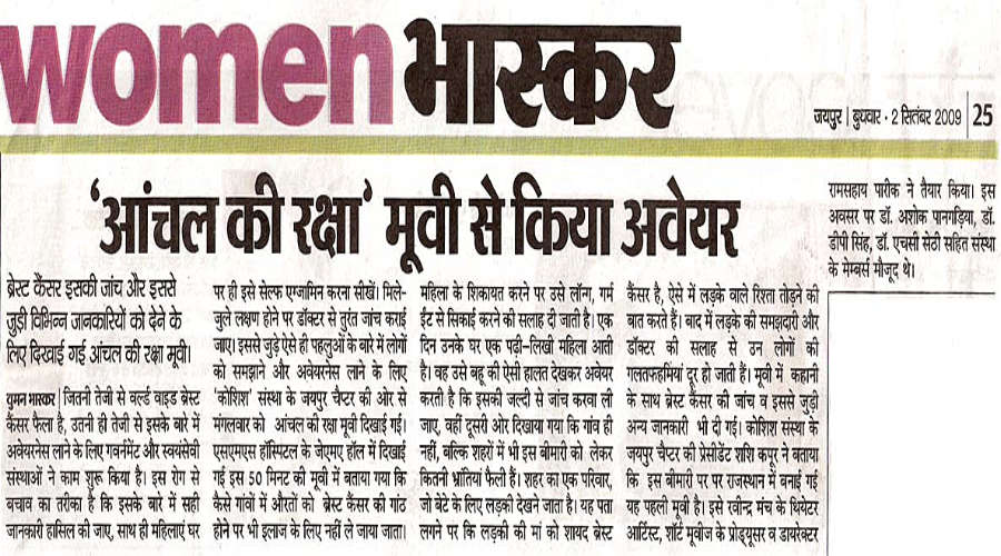 A DOCUMENTARY - DRAMA FILM ON BREAST CANCER AWARENESS 'Aanchal Ki Raksha', produced by Koshish, was released on 1st September, 2009 by Dr. Ashok Pangariya, Principal and Controller, S.M.S. Hospital, Jaipur. It is a comprehensive film covering all aspects of breast cancer e.g. medical, personal, psychological and emotional. The duration of the film is 50 minutes.
